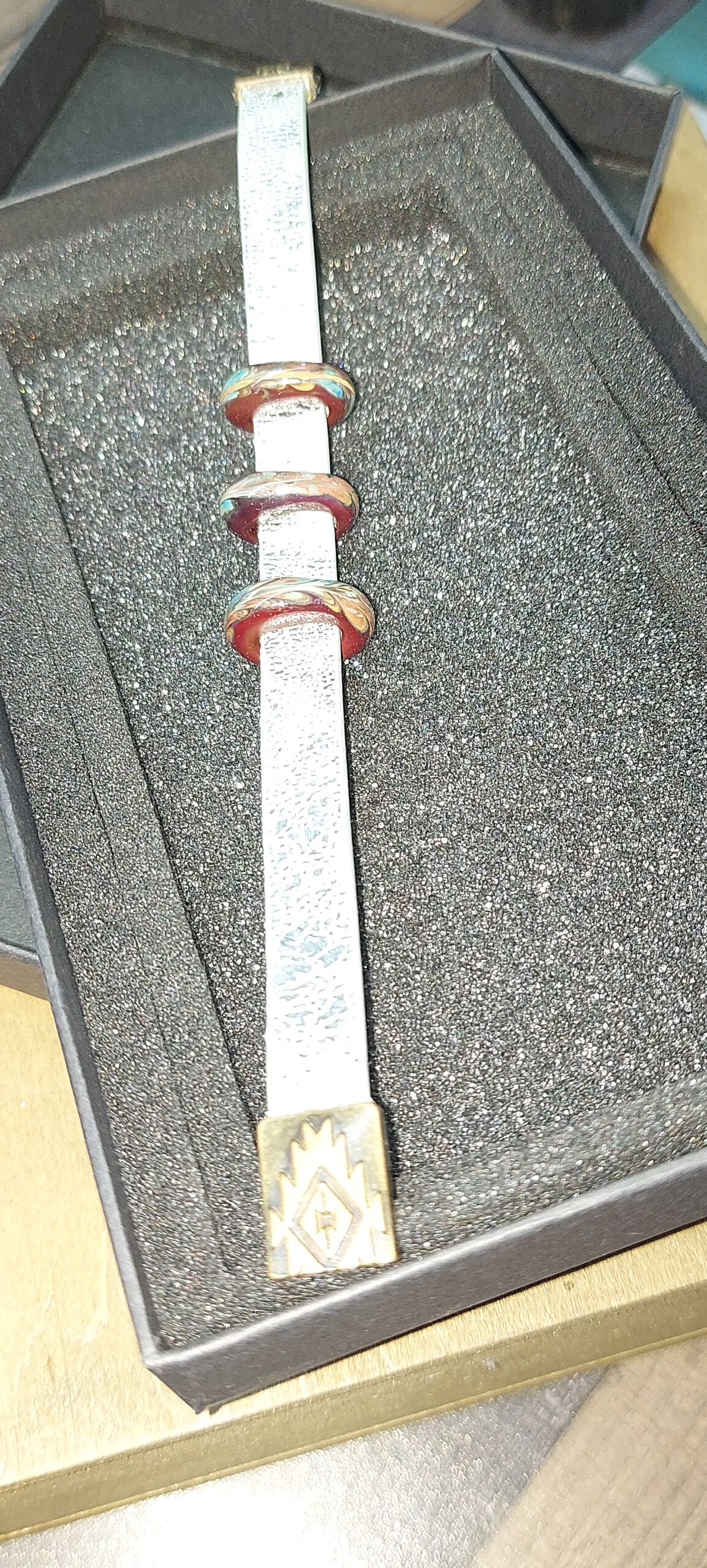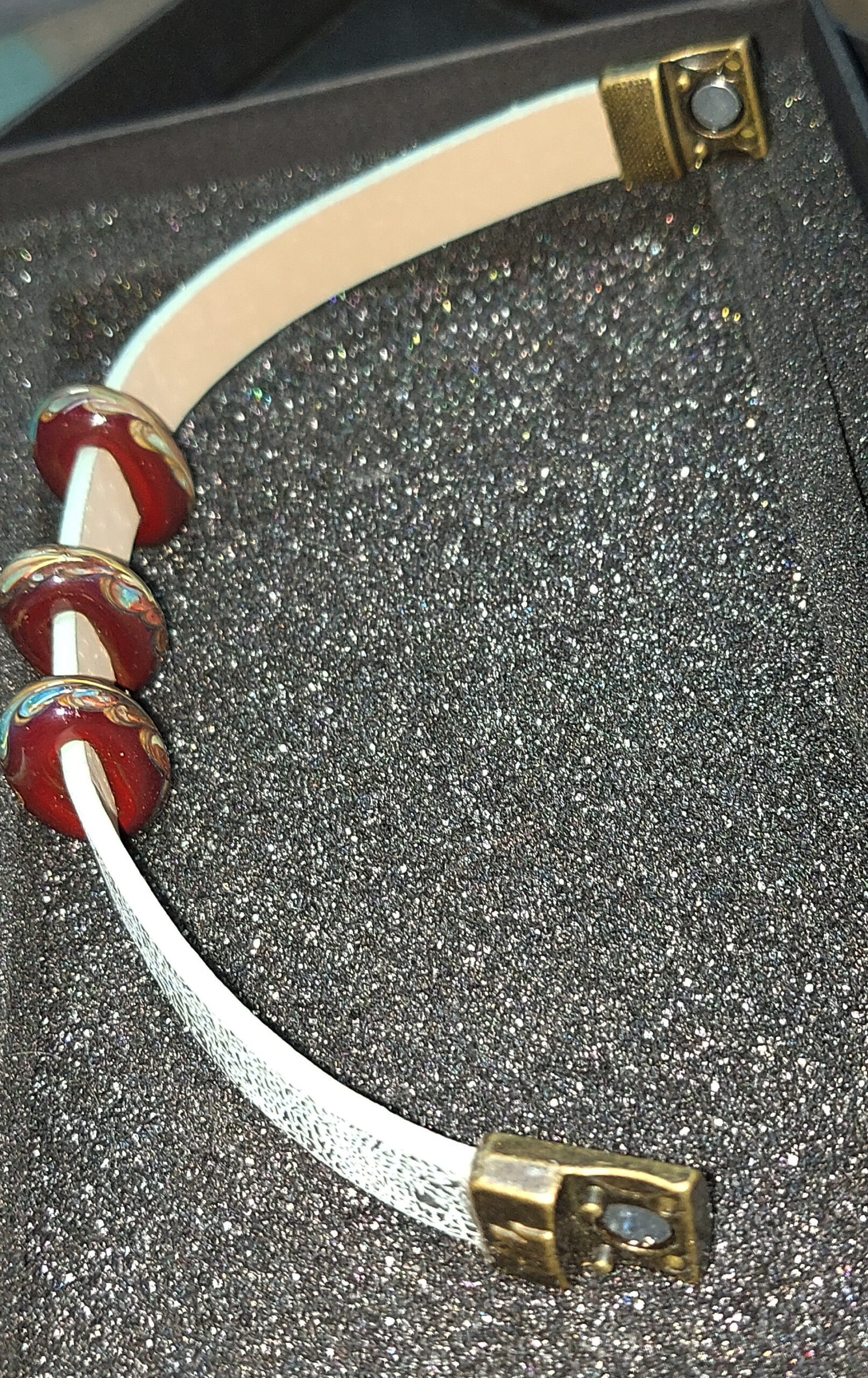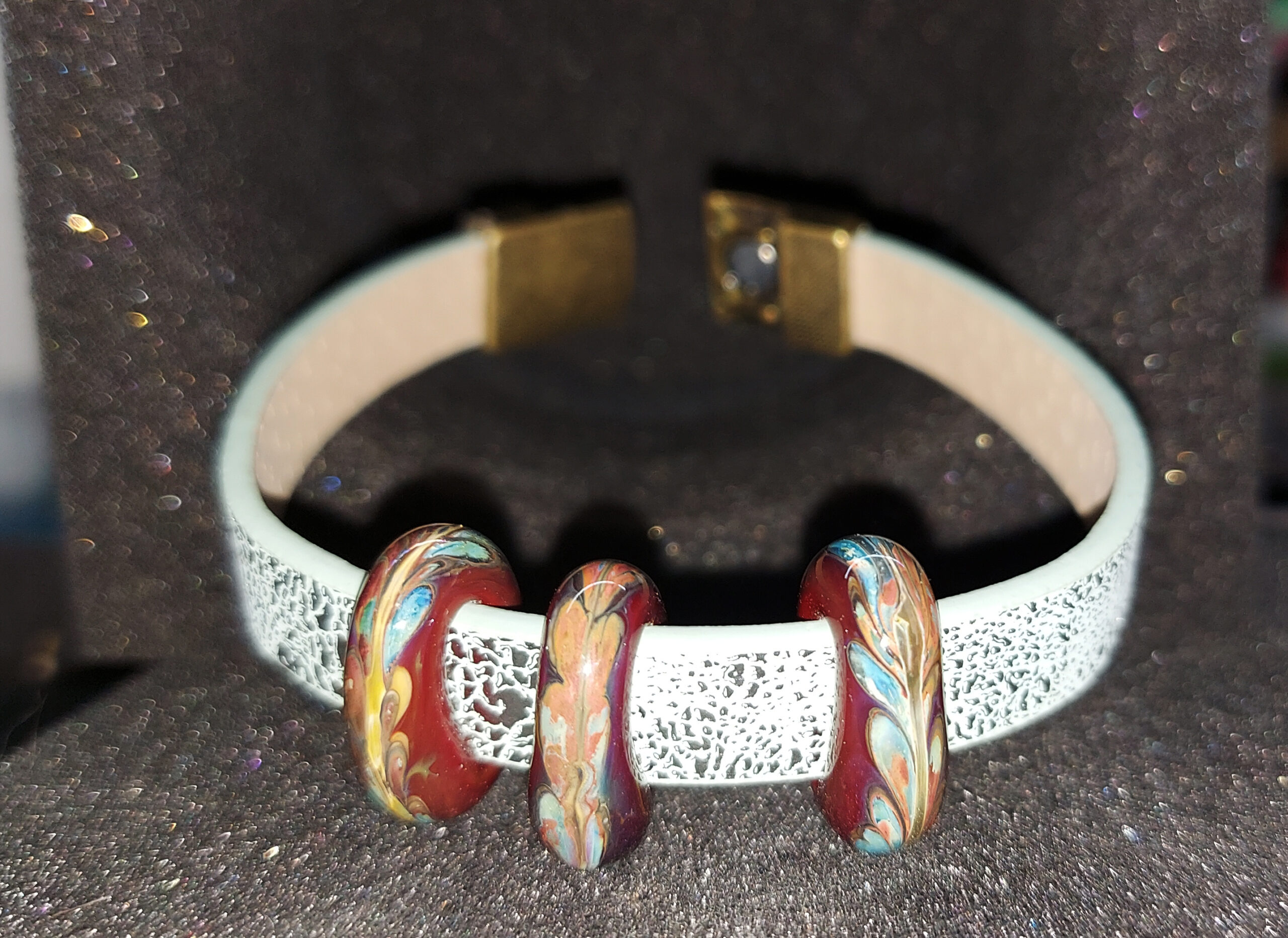 3 designer beads with a flat hole, which allows you to move the beads around the bracelet, but they will remain fixed in the place you choose.
