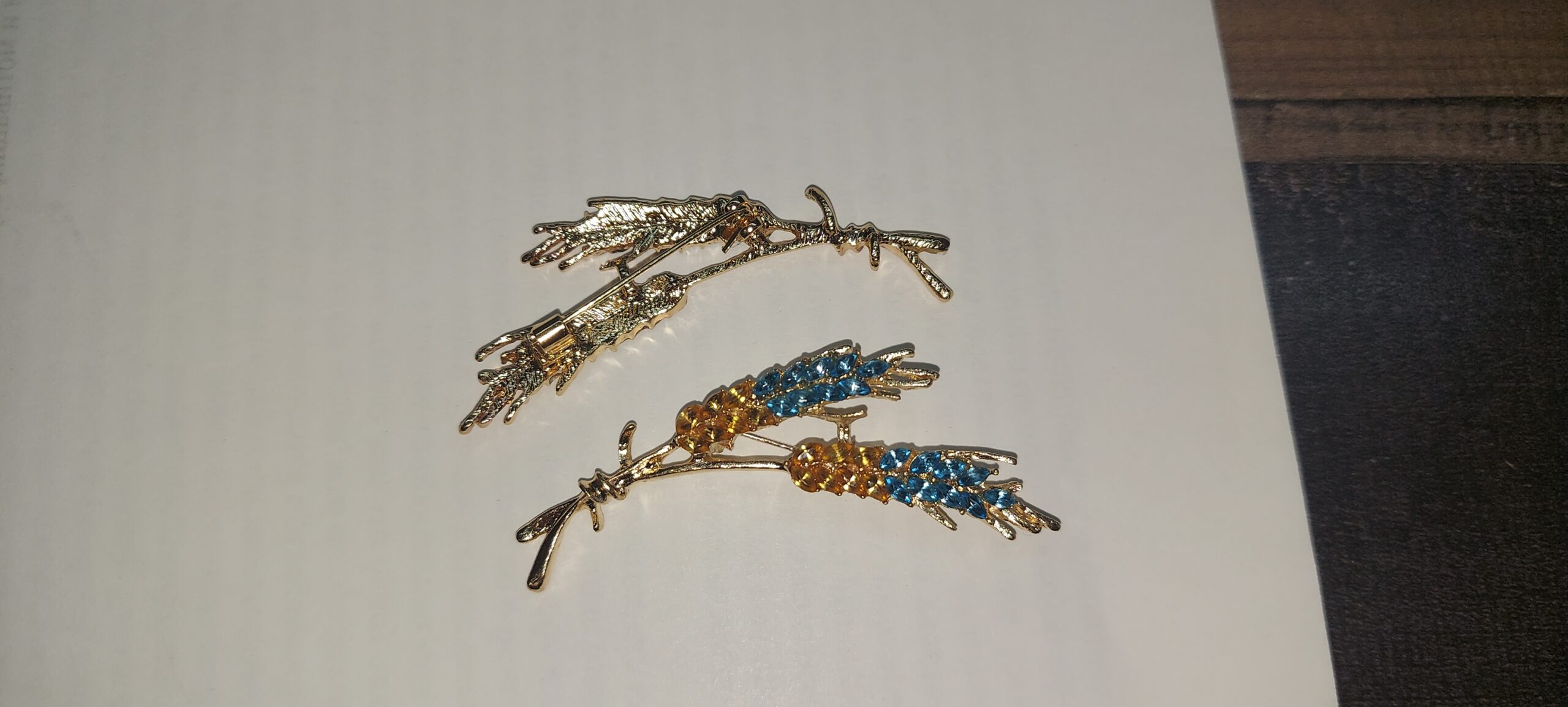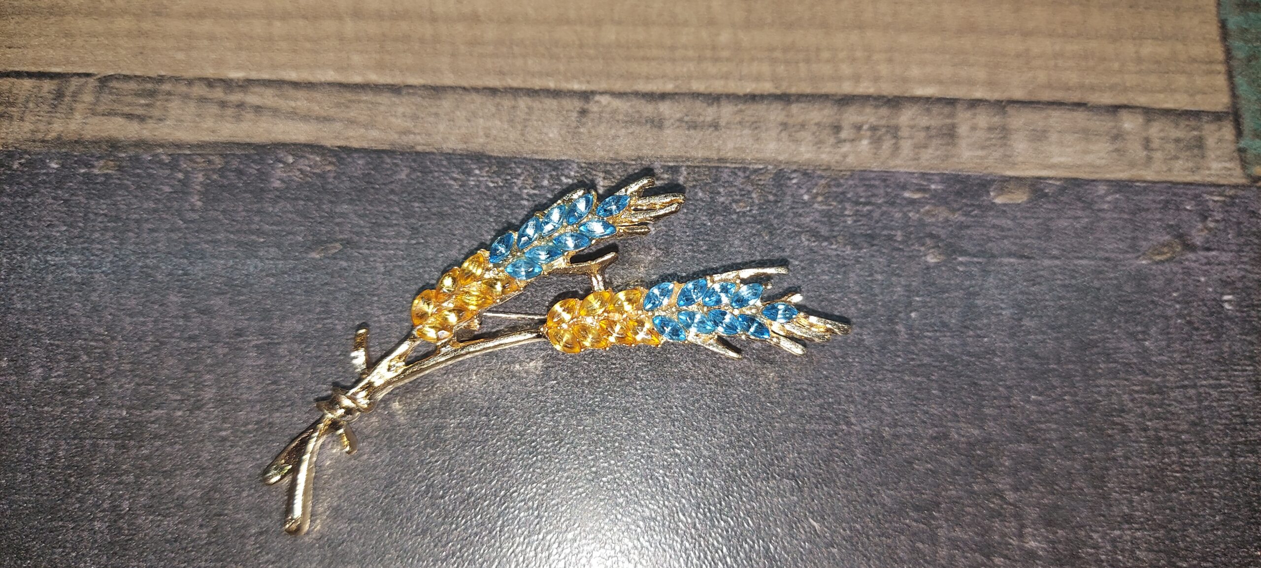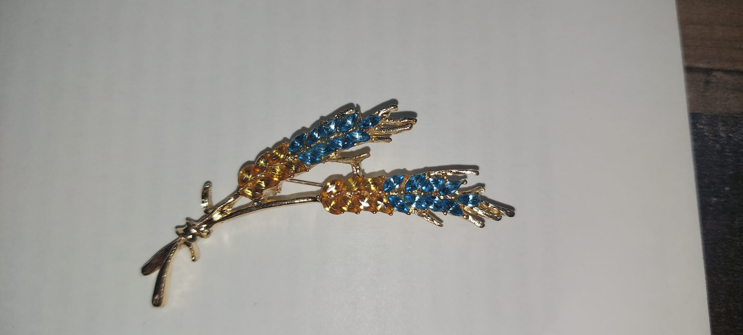 brooch in the form of ears of corn is made of golden metal, decorated with rhinestones in the colors of the national flag of Ukraine.