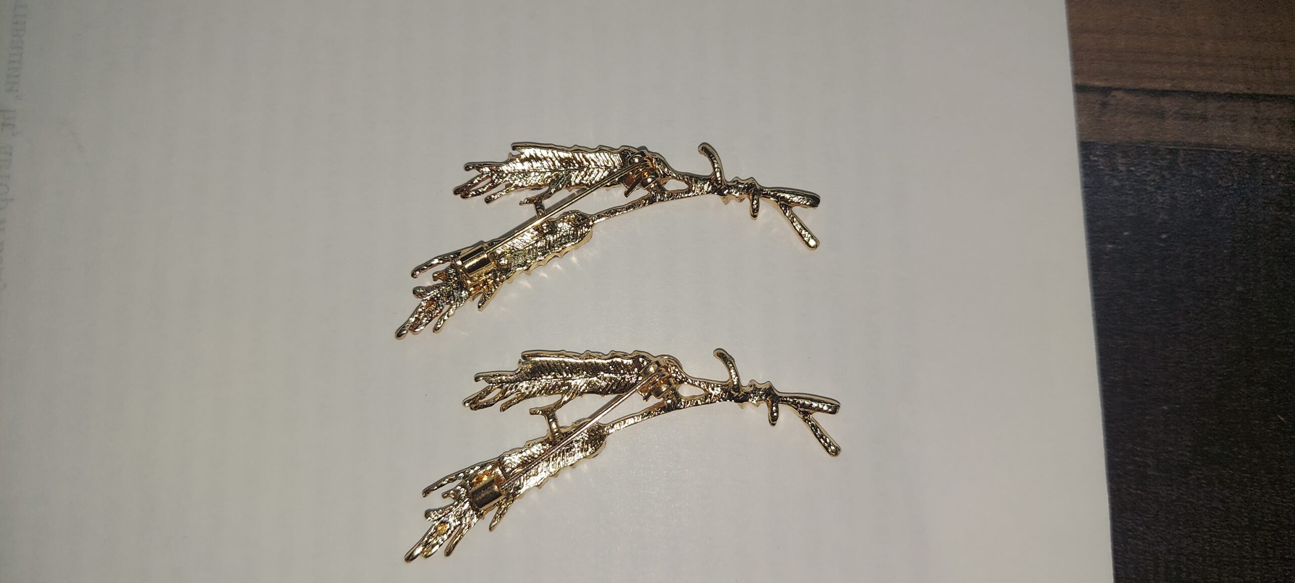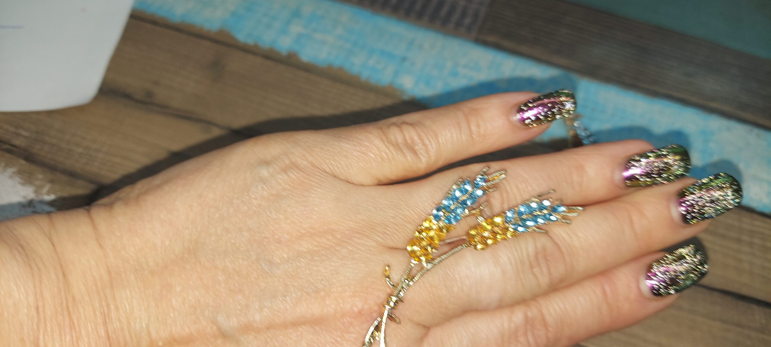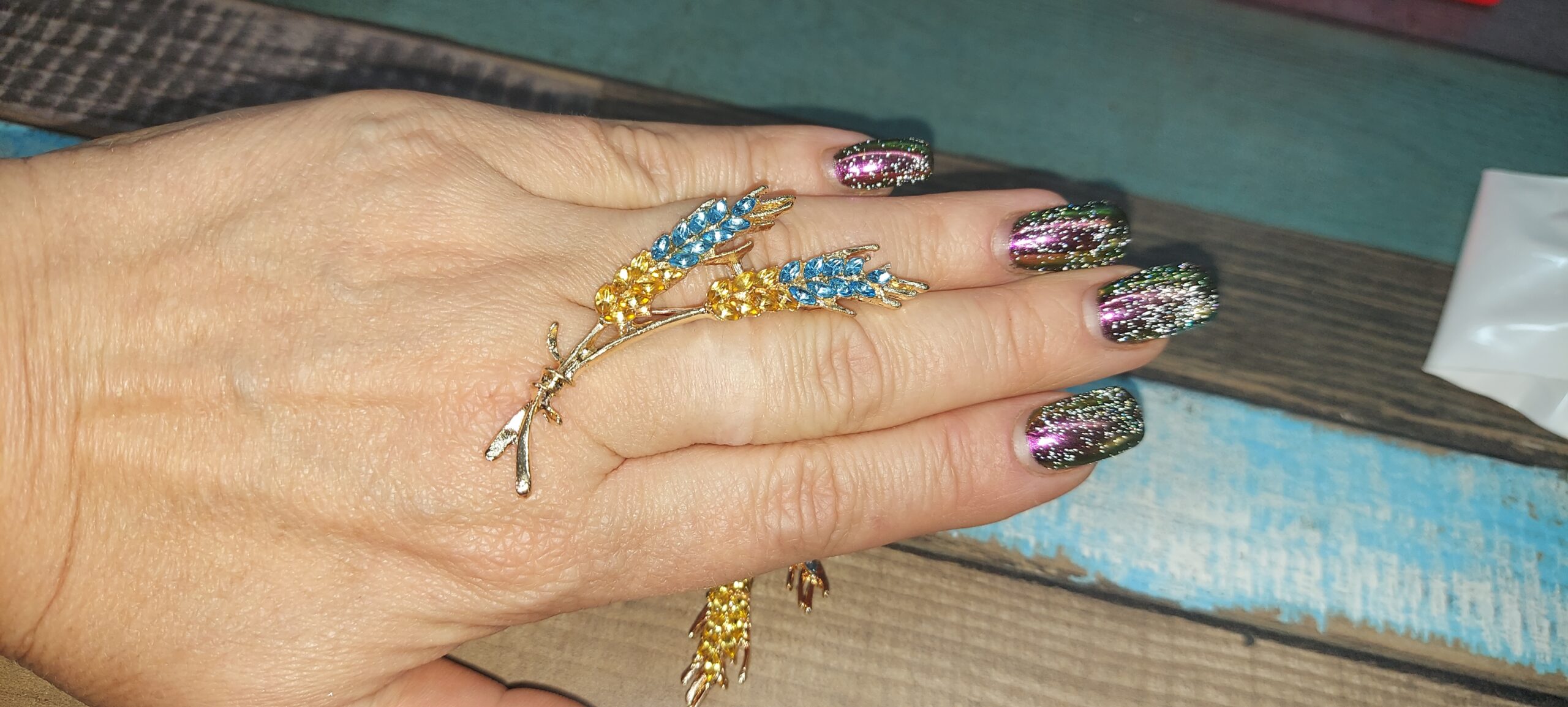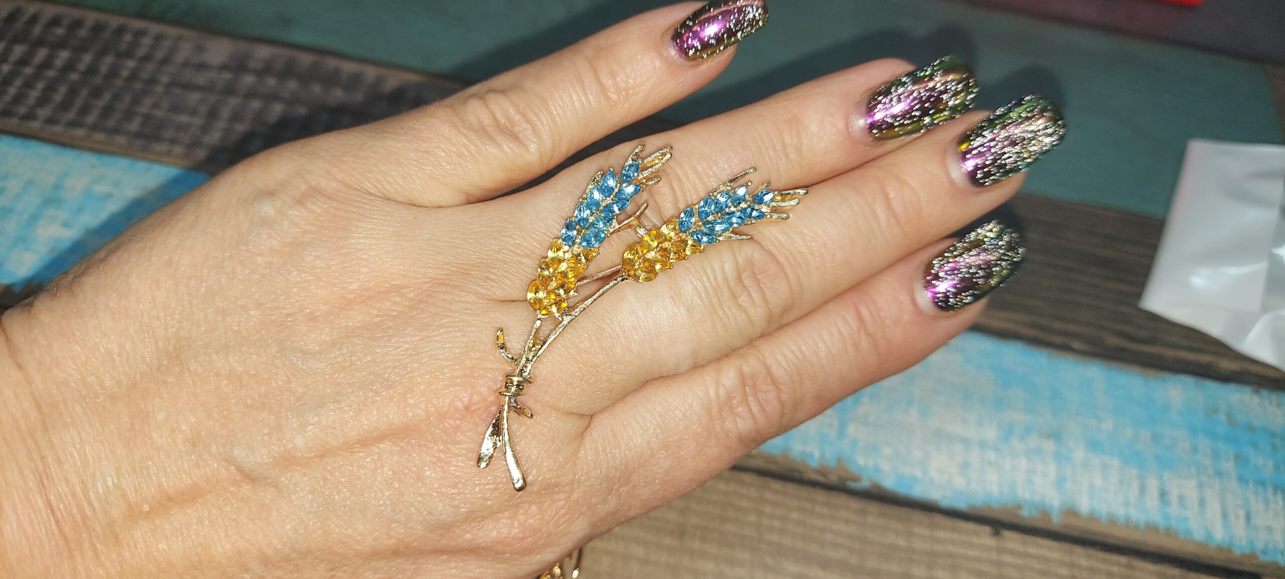brooch in the form of ears of corn is made of golden metal, decorated with rhinestones in the colors of the national flag of Ukraine.
